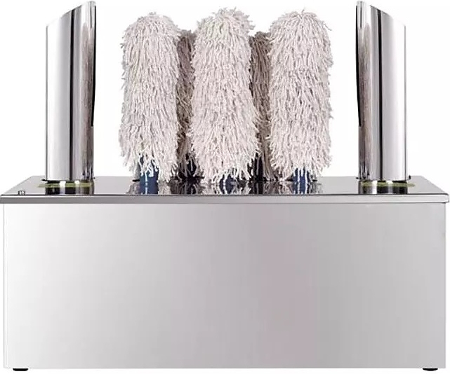 Имеет надёжный мотор и влагозащитный выключатель. Резиновые ножки обеспечивают устойчивость оборудования при работе. Материал корпуса выполнен из нержавеющей стали, щётки – из микрофибры. Используется в кафе, барах, ресторанах, столовых.