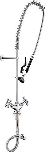 Имеет смеситель горячей и холодной воды и кронштейн для крепления к стене. Металлическая оплётка шлангов защищает их от механических повреждений. Корпус и оплётка шлангов изготовлены из нержавеющей стали, шланги – из латуни. Используется в моечных на предприятиях общественного питания и торговли: супермаркетах, столовых, кафе и ресторанах.