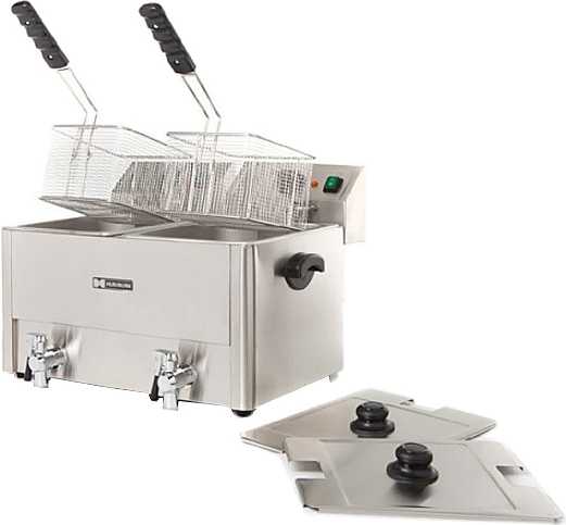 Оснащена аварийным термостатом, отключающим питание при низком уровне или высокой (выше 230 °C) температуре масла, или при перегреве ТЭНа. Имеет 2 ванны, что позволяет существенно ускорить процесс приготовления и быстрее обслуживать клиентов. Ванны имеют раздельное регулирование – при малой загрузке заведения можно использовать только одну из них для экономии электроэнергии. Два крана для слива масла помогают быстро очистить ёмкости.