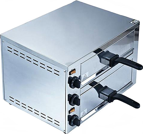 Оснащена термостатами для раздельного управления температурой ТЭНов верхней и нижней камер. Имеет таймер со звуковым сигналом (до 15 минут). Съёмная ручка и регулируемые ножки упрощают эксплуатацию оборудования. Корпус изготовлен из нержавеющей стали.
