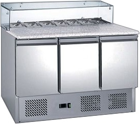 Оснащён статической системой охлаждения с вспомогательным вентилятором. Столешница оборудована отсеками под гастроёмкости и прямоугольной полкой из стекла. Три отдела для хранения имеют по 1 полке за каждой дверью.